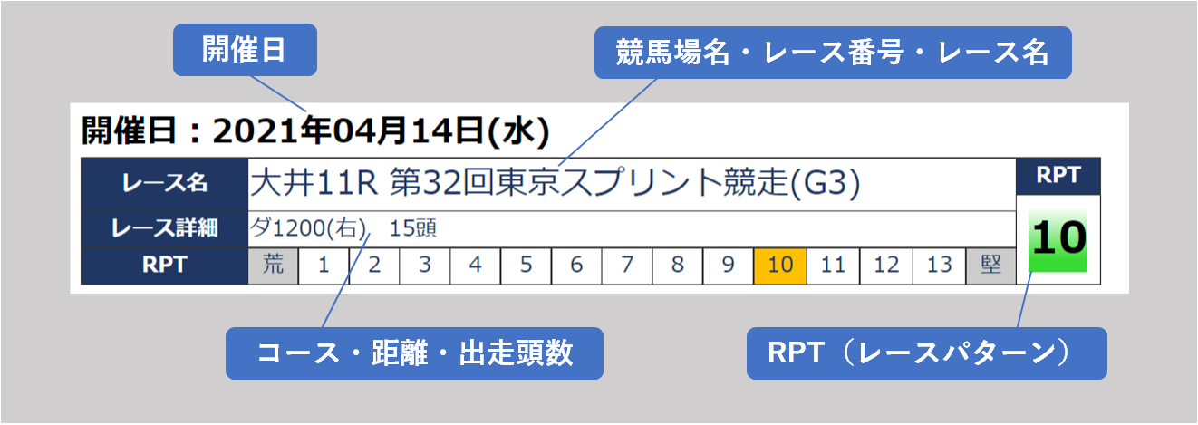 レース波乱度を表す競馬クラスター独自指標です。RPTは1~13まで存在し、数字が大きいほど堅い決着になりやすい特徴があります。RPTの背景色は3連単の『平均配当』を基準とし、平均配当が高くなるにつれて青→緑→赤に変化します。同じRPTの中でも堅いレース・荒れるレースを判断する参考にして下さい。