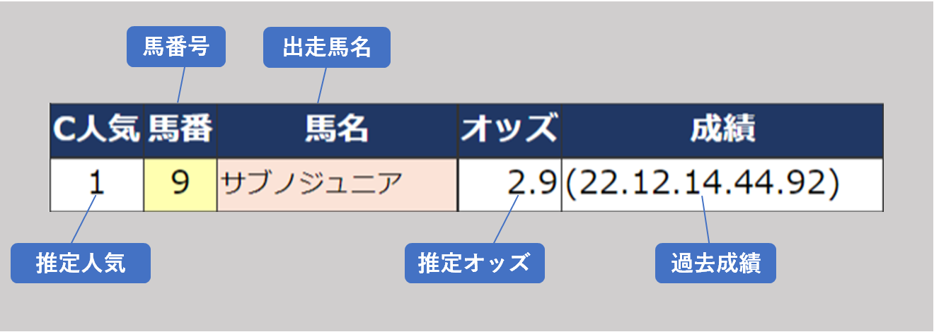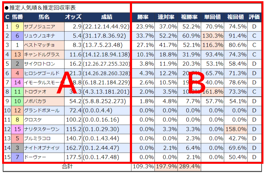 回収率表には枠色に対応した馬番や馬名といった出走馬情報はもちろん、推定人気を示したC人気、過去のレース結果を基に独自分析して算出した推定オッズを記載しています。当日オッズと比較して『過小・過剰』の参考にしてください。