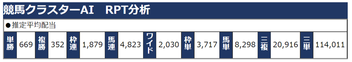 推定平均配当は過去のレース結果を分析し算出しています。同じRPTであっても出走頭数や競馬場など条件によって数値が異なりますので、こちらも併せて堅いor荒れるの判断にご活用ください。