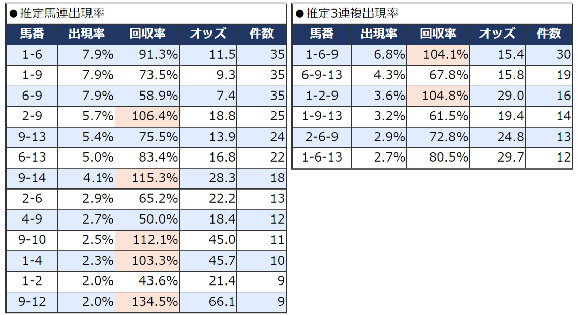 出現率分析はそのレースにおいての馬連、3連複の出現率の予測値を回収率つきで掲載しています。期待値高い目や買い目の推定オッズをレース前に把握することができます。