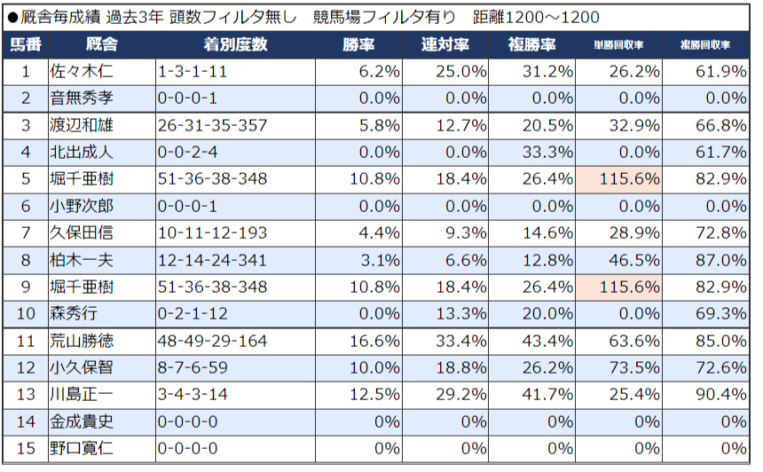厩舎ごとの成績は「競馬場・距離」の条件から基本的に過去3年~10年分の成績を掲載しています。成績数が極端に少ないと判断した場合は距離条件を省いて掲載する場合もございます。