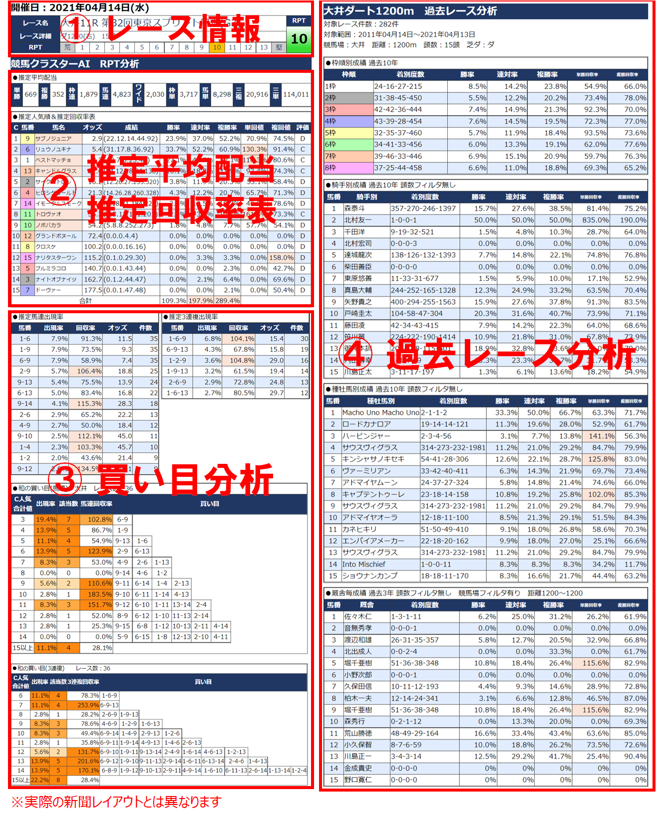 全頭の推定オッズ、勝率、連対率、複勝率さらには単勝回収率と複勝回収率まで掲載しています。今までの競馬新聞では知り得なかった馬券効率の良い馬(期待値の高い馬)が分かる画期的な新聞となっています。