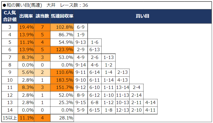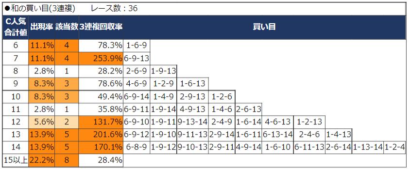 和の買い目分析は過去の類似レースにおける馬連、3連複の決着とC人気の組み合わせを分析した結果を表しています。