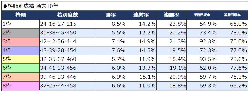 一般的に公開されているデータは頭数を加味していないものがほとんどですが、競馬クラスターの枠順成績は出走頭数別に算出しています。