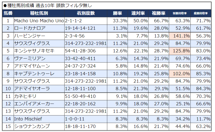 種牡馬別成績も「競馬場・コース・距離」の条件から過去10年分の成績を掲載しています。相手選びに迷った際は、成績から回収率の高い馬を選んでみてもいいかもしれません。