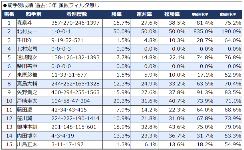 騎手別成績は「競馬場・コース・距離」の条件から過去10年分の成績を掲載しています。回収率の点から買える騎手、買えない騎手の判断が可能です。
