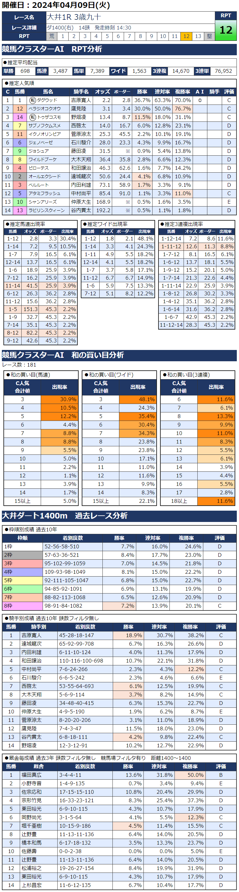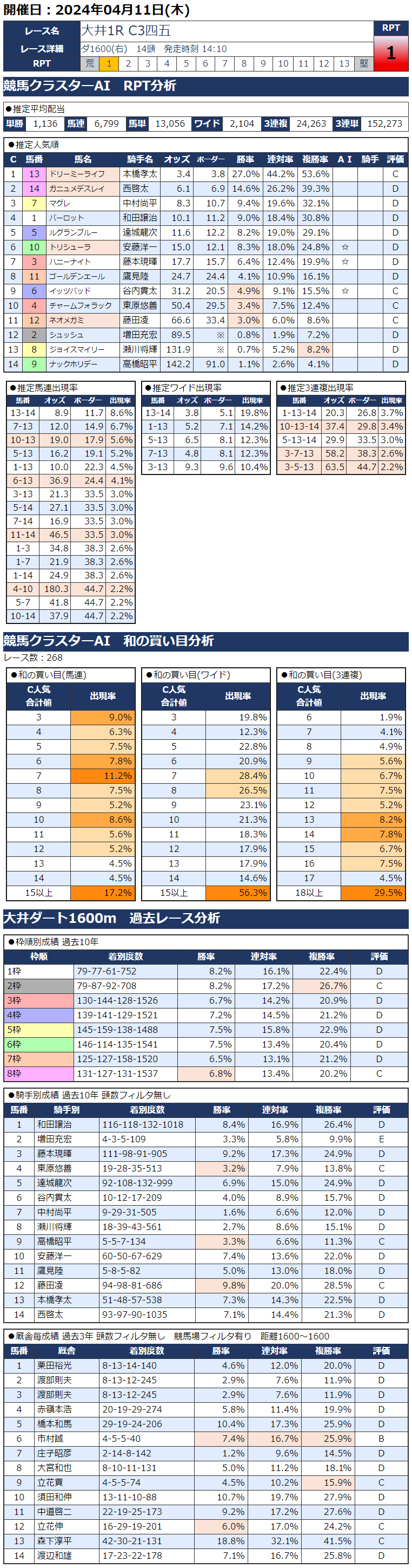 競馬場別・RPT別 馬連の和データ一覧